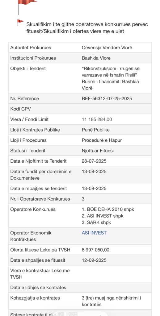 Një tjetër shqetësim lidhet me kompaninë zbatuese, “ASI INVEST” shpk. Sipas informacioneve, kjo kompani ka pasur edhe raste të tjera ku punimet nuk janë marrë në dorëzim nga Bashkia për shkak të cilësisë së dobët. Pavarësisht këtyre precedentëve, ajo vijon të shpallet fituese në procedura të ndryshme prokurimi publik.
